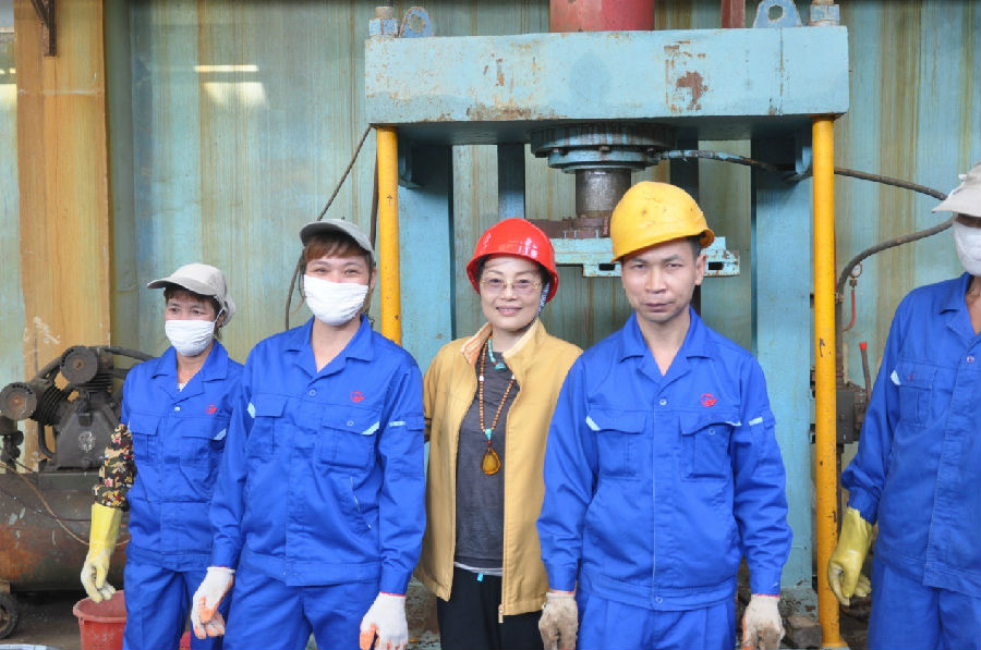來到精煉一車間,桁吊從空中平移過來一排成形的鎳板,場面恢宏,鎳板剛一觸地,工人們分工明確,一組工人熟練地快速抽掉銅棒,一組工人嫻熟地取下鎳板,除去鎳板頂部的綠色雜質(zhì),還有一組工人迅速把鎳板疊加整齊,送上打包機(jī)捆扎牢固。同時,工人們打掃場地,收拾銅棒和鋼絲繩,行動迅速,忙而不亂,有條不紊??吹竭@情景,趙總很感動,佩服工人勞動技能好,工作熱情高,應(yīng)工業(yè)的要求與工人合影留念,工人們高興地站在趙總兩邊,愉快合影。離開車間時,趙總不停向工人們揮手致意。