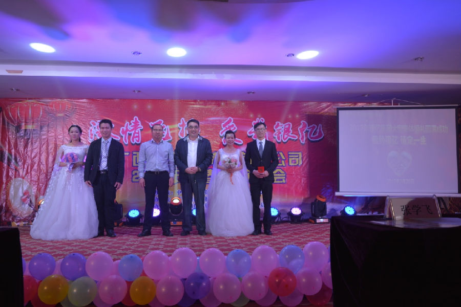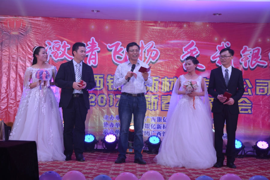 晚會(huì)中段安排了集體婚禮,給2對(duì)新人舉辦婚禮,將晚會(huì)歡樂(lè)的氣氛推向了高潮。新郎楊家樹和新娘吳秋麗;新郎藍(lán)偉東和新娘潘桂嬌,都是大學(xué)本科畢業(yè),學(xué)的是化學(xué)專業(yè),入職公司,工作勤勉,奮發(fā)向上,他們把心放在了工作上,把家安在了公司,把夢(mèng)想放在了銀億事業(yè)上,產(chǎn)生了神奇的“化學(xué)反應(yīng)”,他們比翼齊飛,喜結(jié)連理,是眾望所歸,佳偶天成。廣西銀億公司工會(huì)主席章群宏作為證婚人,發(fā)表了熱情洋溢的證婚詞:“在今天大喜的日子里,我謹(jǐn)代表公司工會(huì),向兩對(duì)新人表示熱烈地祝賀和美好地祝愿。衷心祝愿他們相濡以沫,白頭偕老,甜甜蜜蜜,幸福永遠(yuǎn),早生貴子!”章主席查看了兩對(duì)新人的《結(jié)婚證》,幽默地大聲說(shuō):“我宣布:新郎楊家樹和新娘吳秋麗;新郎藍(lán)偉東和新娘潘桂嬌,婚姻合法有效,即日起,持證上崗,掛牌營(yíng)業(yè)!”全聲歡聲雷動(dòng),掌聲四起,經(jīng)久不息。這場(chǎng)集體婚禮,表達(dá)了員工“愛我銀億”的心聲――銀億凝聚人心,事業(yè)興旺發(fā)達(dá)!
