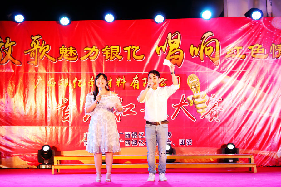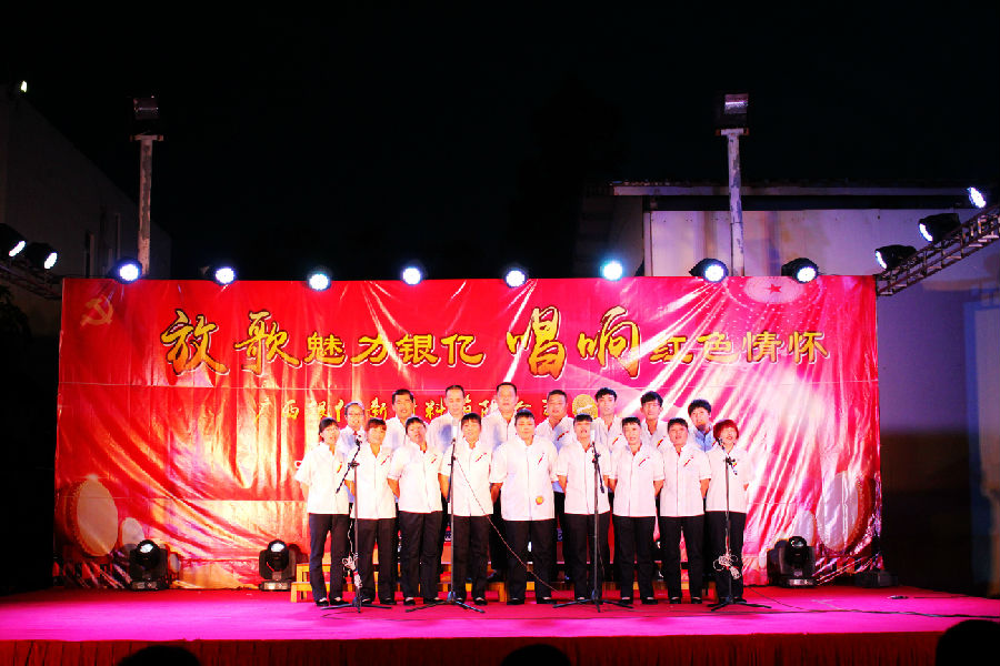 7時(shí)30分,風(fēng)度翩翩的主持人朱旭波、周海華大步走向舞臺中央,宣布紅歌比賽正式開始,廣西銀億黨委副書記王小豐發(fā)表了熱情洋溢的祝詞。