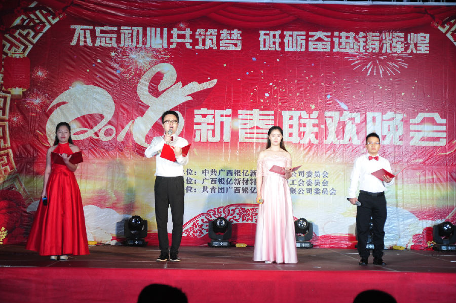 “送走金雞,又是一年激情的歲月;迎來(lái)瑞犬,又是一段如火的時(shí)光”。3月9日晚,廣西銀億新材料有限公司舉行了以“不忘初心共筑夢(mèng),砥礪奮進(jìn)鑄輝煌”為主題的2018年新春聯(lián)歡晚會(huì)。出席晚會(huì)的嘉賓兼評(píng)委有廣西銀億總經(jīng)理張學(xué)飛,副總經(jīng)理任衛(wèi)東、陳為清、朱紅斌,黨委委員和潤(rùn)秀,黨委委員兼工會(huì)主席章群宏。